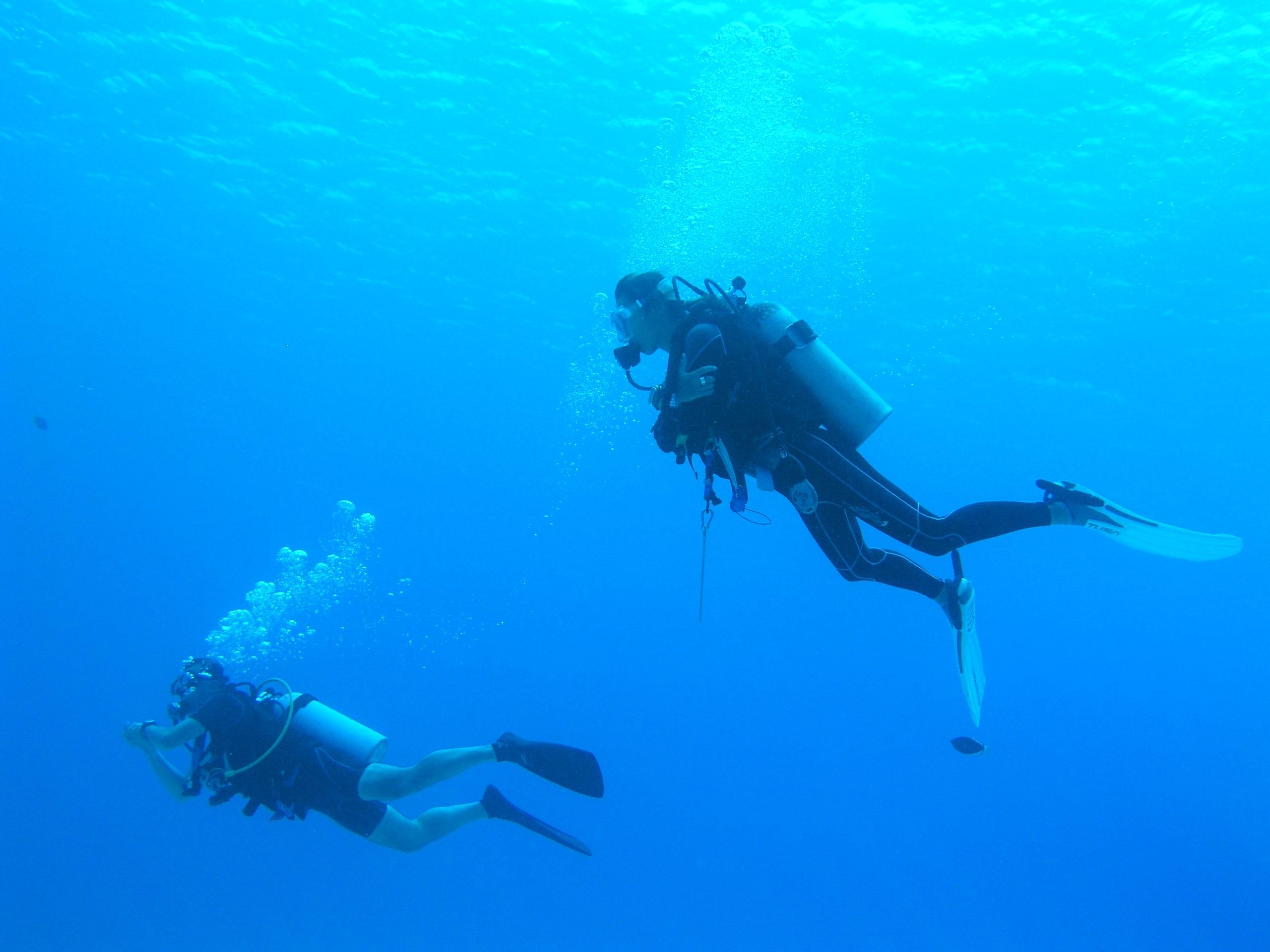 今回のメンバーは1本目と同じです。ガイドのKeiさんとAkariさん、女性ゲスト2人と、アドバンス講習中の男性1人、イントラ免許持ってる男性ゲストと私の7人です。 海の中は、ラウラウより明るくて綺麗な感じがします。透明度が高いので、太陽の光が海底までよくとどいて良い感じ。海底の白い綺麗な砂浜もGood!です。でも、珊瑚はあんまり見なかったです。魚はそこそこいましたね。 エアー消費が19.2L/minとあいかわらず多かった(´Д`;)