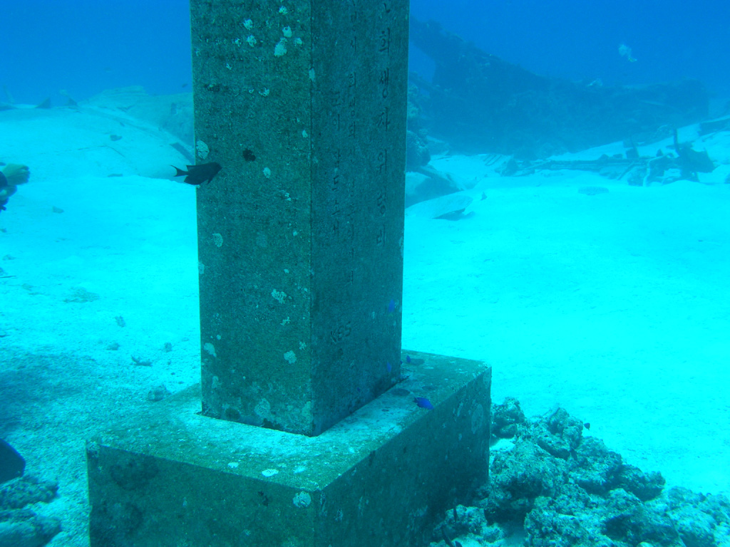 ここも1本目と同じで深いところで水深10mぐらいです。潜っていきなり、海底に石碑が(1)。何これ? ハングル文字が書かれてました。どうやら韓国の慰霊碑みたいです。