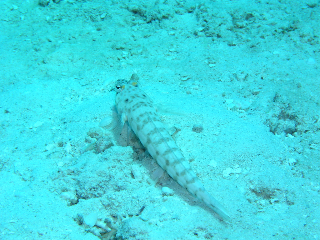 海底の砂地の上には、じっと止まった状態の不明魚(9)がいました。これなんなんですかぁ? わかる人は足跡板にでも書いて下さい。お願いします。