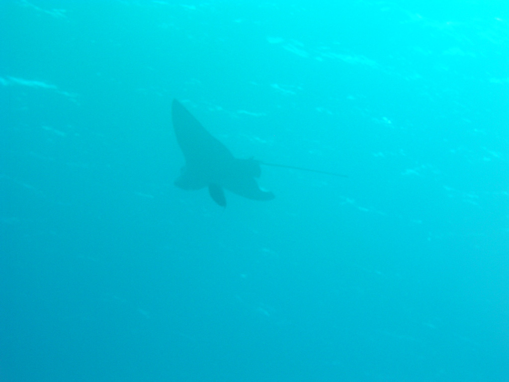 またまたマダラトビエイが現れました。今度は、俺っちのかなり近く。俺っちはゆっくりマダラトビエイに近づくように泳いで、横から(14)とちょっと上からと写真を撮った。なかなか良い感じでフレームに入ってる。急浮上にならないように気をつけてゆっくり上に出ながら写真撮れるようになった自分のスキルに感心したりして(;^_^A