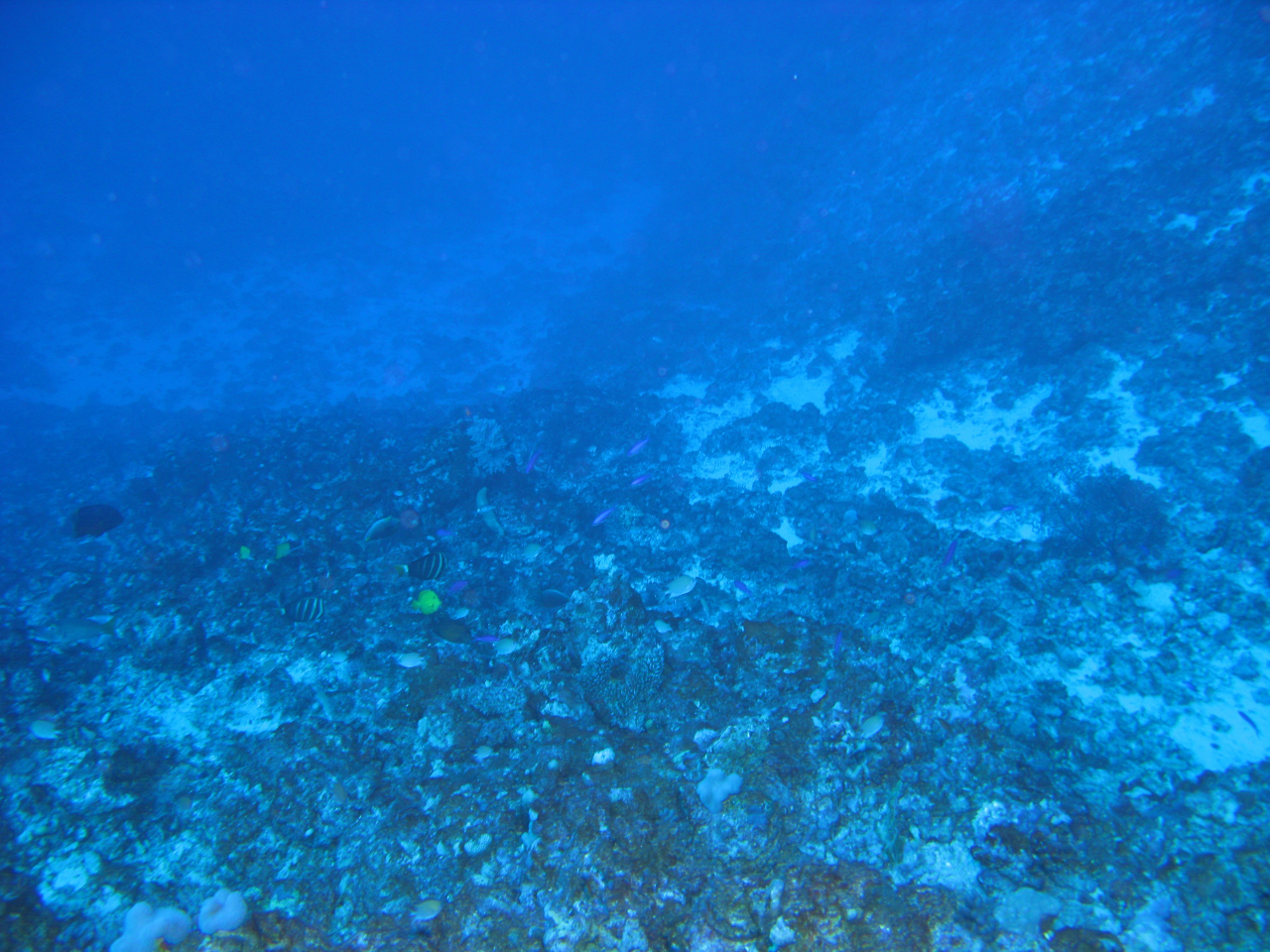 ナフタンドロップオフの地形。 かなり急峻なドロップオフ。 ドロップオフはかっこいいねぇ。 ここで水深40m前後。 ここから、1枚目の写真のようにダラダラと海底に続くのだ。 オリンパスの水中ハウジングは、パプアニューギニアで56mまで行っても普通に操作できたのだが、新調したキャノンのハウジングは全然ダメ。 40m付近で、いろんなボタンが重くなって、ちゃんと戻らない。 キャノンのハウジングは深場好きには向かないと言うことがわかった。 そんな話をボート上でしていると、ボートオーナーは「ソニーも深場大丈夫だよ」といっていた。 そういえば、以前にボートオーナーはソニーのカメラもって、俺っちよりずーっと深くまで魚探しに行っていたな。 (;^_^A アセアセ…