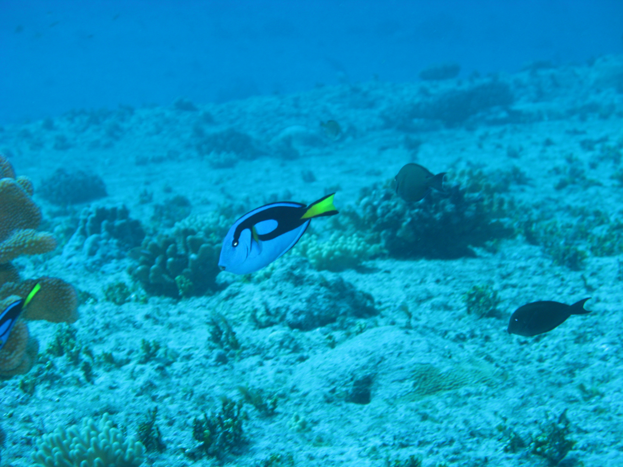 南国チックな写真。 浅場で、ルリメイシガキスズメダイと珊瑚です。 |