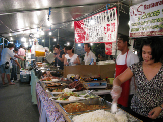 こんな風にバーベキューとか中華&コリアン系の食べ物屋が並ぶ。 バーベキューは1串1ドル。 1串がかなりでかい。 味は期待しちゃいけません。 あの雰囲気の中だから、食べれるけど、冷静に食べたらはっきり言ってまずい。 レストランであれが出てきたら、食わないな。 |