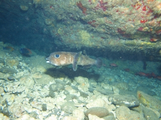 ハワイアンモンクシールはいないかと壁の穴を覗くと大きなネズミフグいた。 |