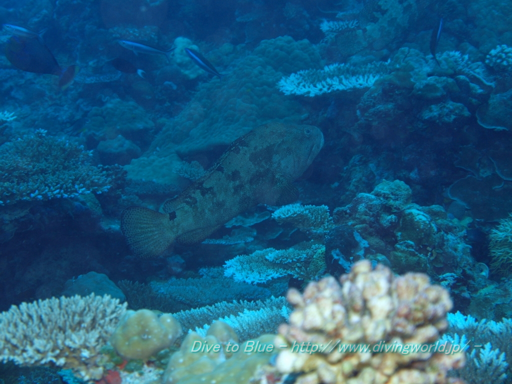 中ぐらいのサイズのアカマダラハタがリーフを悠々と泳いでいる。 |
