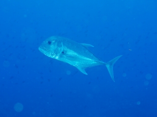 ギンガメアジが目の前のドロップオフの深めのところを進んでいく。 |