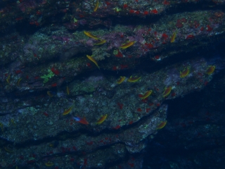 ちょっと移動したところで、昨日ハワイアンロングフィンアンティアスを見つけた2段ドロプオフの場所に来た。 いけないダイバーの俺っちは、みんなから勝手に離れて2段ドロップオフの棚際に一直線 棚際から下を覗くと、昨日は気づかなかったけど昨日と逆側にもっといっぱいハワイアンロングフィンアンティアスが群群状態! \(^O^)/ |