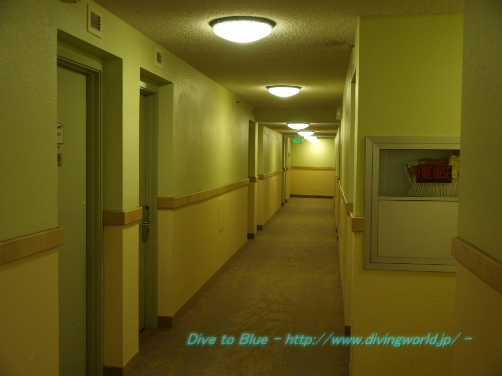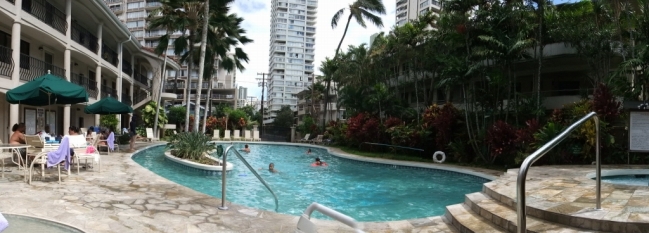 上は、ワイキキサンドビラの中庭のプール。 高いホテルじゃないので、ホテルの廊下はこんな感じで高級感はゼロですが、部屋は綺麗で良いホテルです。 下は、ホテルの部屋からの眺め。 |