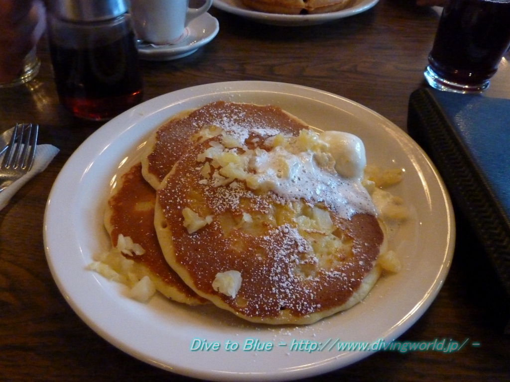 オアフ島での8日間18ダイブを終えて、ガイドのキコさんと、今日ダイビングに参加のもう1人のゲストと、パンケーキを食べに行きました。 オールドパンケーキハウスというお店。 |