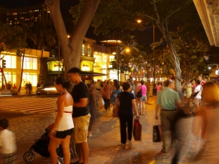 日が暮れたワイキキを散歩。 日が暮れても、カラカウア通りは昼間と変わらない人通り。 いや、大道芸が夜になると集まってくるので、昼間より賑やかかも。 |