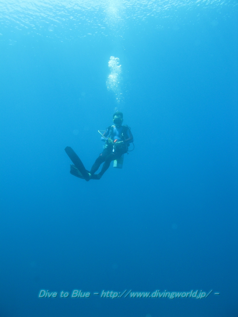 安全停止していると、遠くにブラックフィンバラクーダの群を見つけた。群を別チームのAさんが1人追いかけていた。