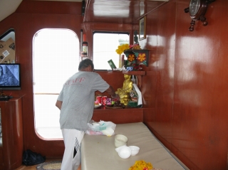さて、前半のシミラン諸島クルーズに引き続いて、後半の南アンダマン海でのダイブクルーズに参加です。 クルーのアペさんが、航海中の安全を願って、出航前にお供え物をしていた。 |