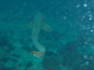 レオパードシャークも、かなり長い時間我慢していたけど、いい加減フラッシュの光が眩しくなったのか、逃げていった。 |
