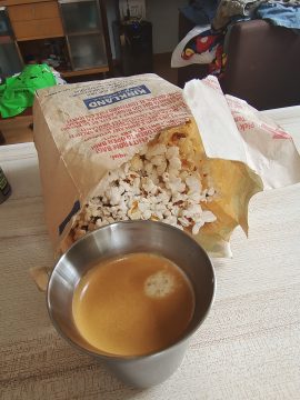 バナナ1本でウォーキングするのは流石に腹減るだろうと、ポップコーンを作って昼食代わり。