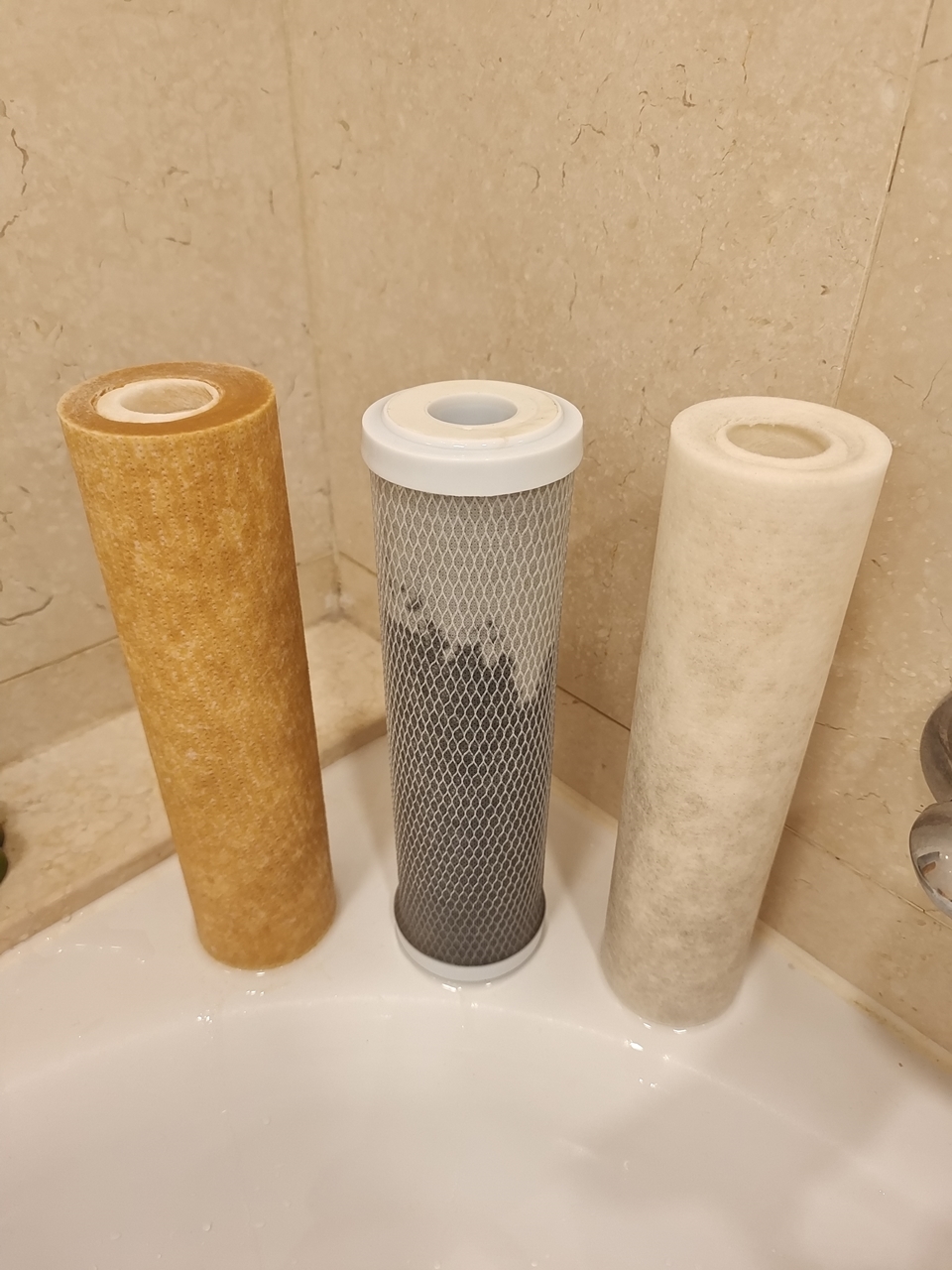 左から初段PPフィルター、2段めの活性炭、3段目のPPフィルター。