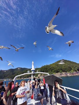 外国人が餌をあげるから、カモメが異常についてくる。