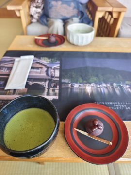 抹茶と茶菓子でまずお出迎え
