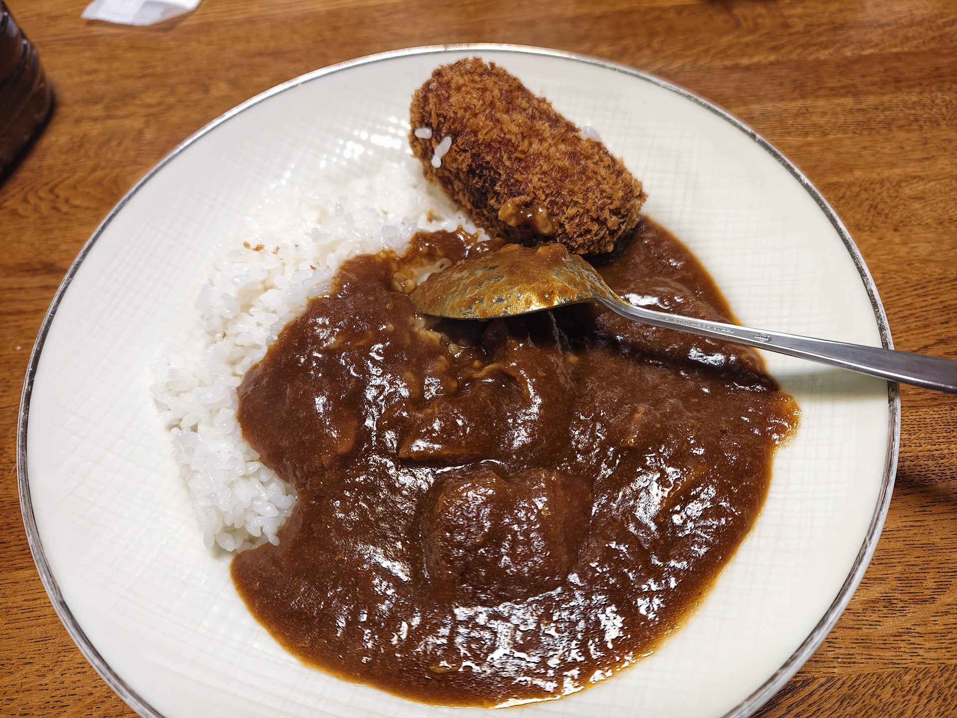 そして、実家に帰宅して食べた晩御飯は、JALカレーに山垣のメンチカツをトッピング。