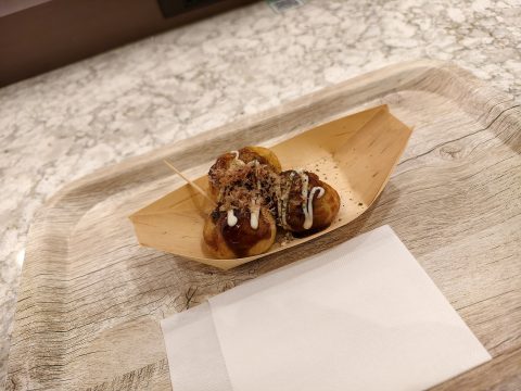 QRコード読み取ってスマホで飲食メニューを表示させるとたこ焼きがあったので注文。