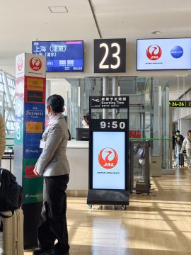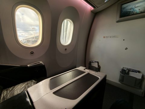 カウンターでチェックインすると、今回もエコノミー席が満席でということで、ビジネスクラスにアップグレードされた。