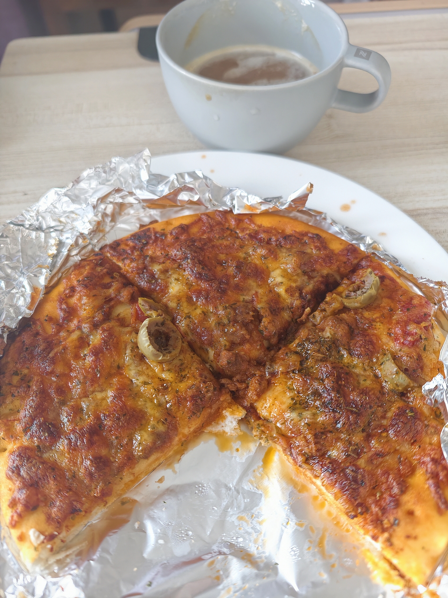 朝からお気に入りの盒马の冷凍ミートソースピザ。
