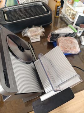 肉の塊を冷凍庫から出して、放置プレー1時間半でちょうどスライサーで切れるぐらいに解凍。