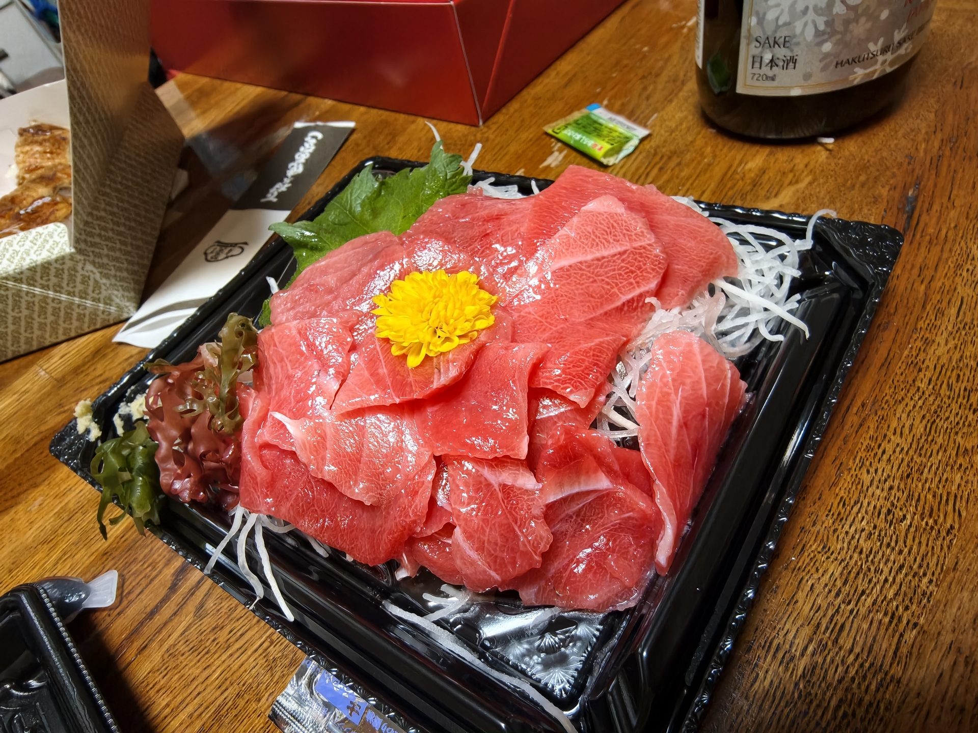 本マグロの切り落としが午後6時頃に4割引きだったので、衝動買いしたけど、中トロだった。
